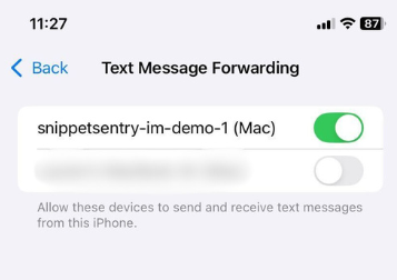 - Once you’ve completed the steps on your phone, check the box in the SnippetSentry menu to acknowledge you have enabled message forwarding, and then click Done.